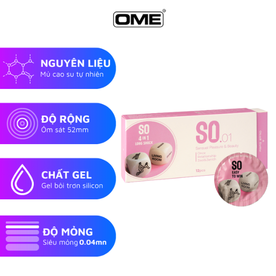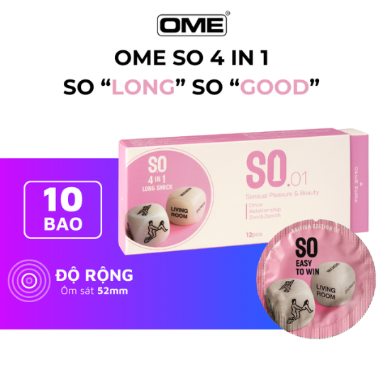 Bao Cao Su SO 4 IN 1 không chỉ giúp phòng tránh thai hiệu quả và ngăn ngừa các bệnh lây truyền qua đường tình dục, mà còn mang lại cảm giác chân thật và khoái cảm vượt trội nhờ thiết kế gân gai kéo dài.